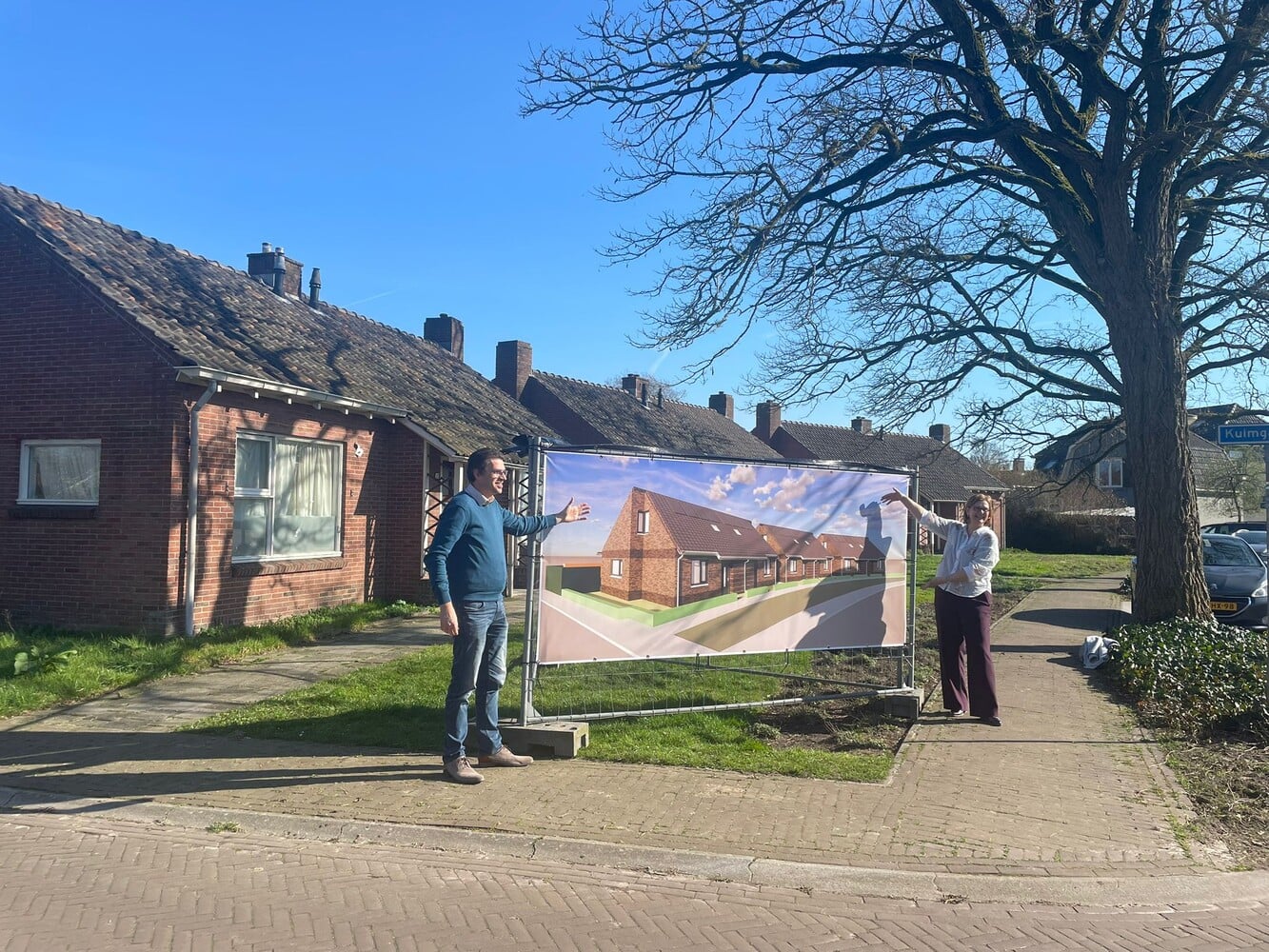 Tijdens een fotomoment onthulden Peter Steijsiger, directeur Kreunen Bouw en Tonita Garritsen, directeur-bestuurder Viverion een impressie van de nieuwe woningen. Op de achtergond zijn de huidige woningen nog zichtbaar